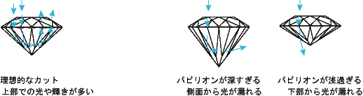 カットのよいダイヤほど、輝きます。形(対称性など)と仕上げ(研磨状態など)をもとに、総合的に決定します。